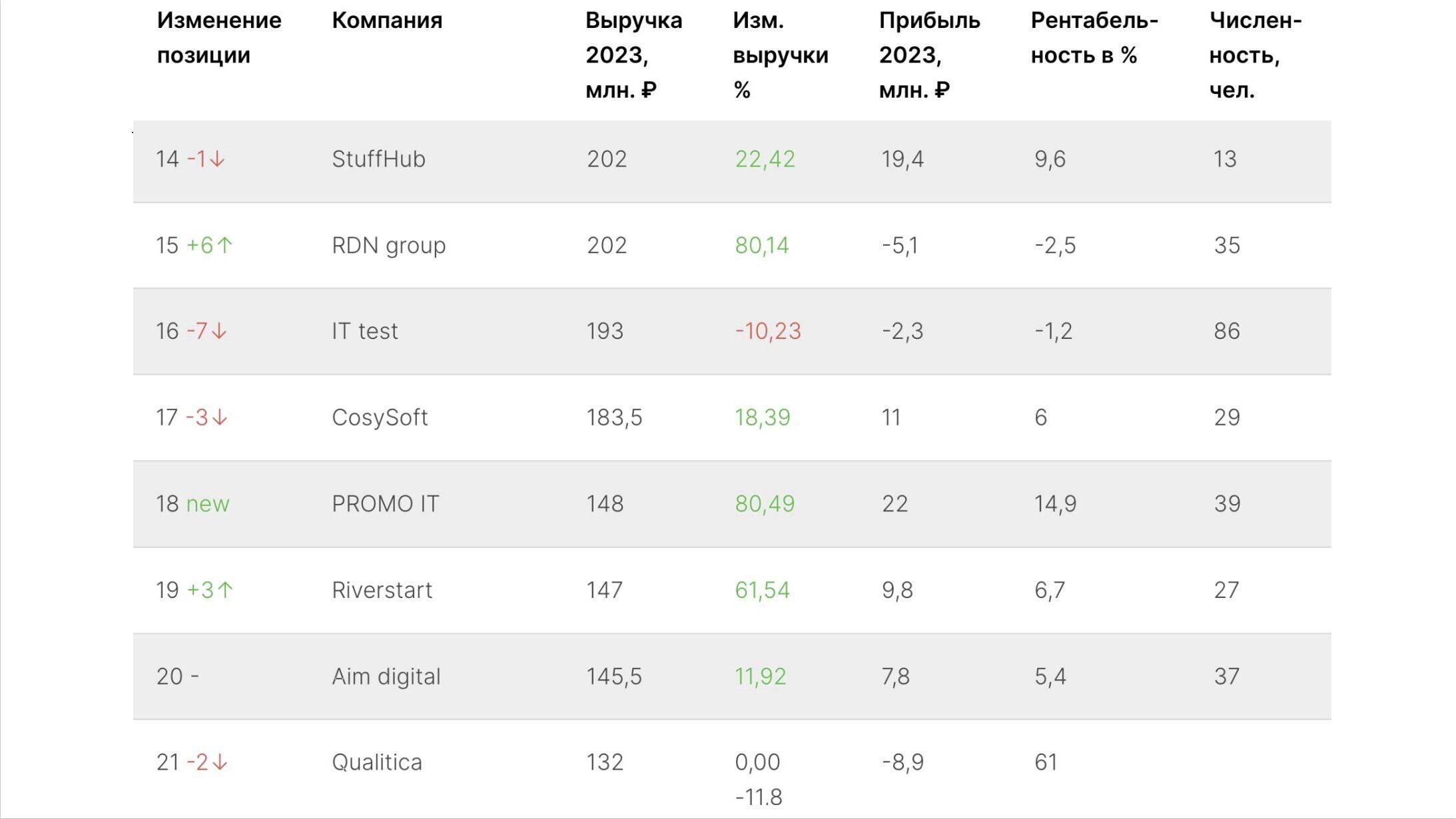 Теперь перейдём к списку компаний с 21 по 14 место.