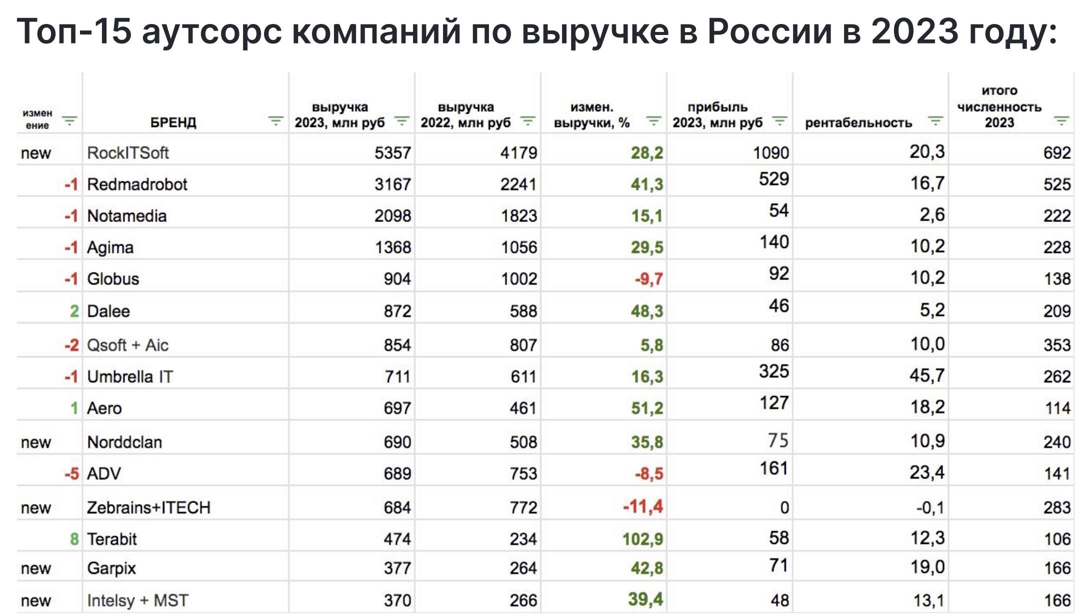 1. RockITSoft (подразделение К2Тех) вышел на первое место. Это отдельная компания, занимающаяся исключительно разработкой. В 2023 году их выручка составила 5,3 миллиарда рублей, что на 28% больше по сравнению с предыдущим годом. Количество сотрудников — ~700 человек, рентабельность — 20%.