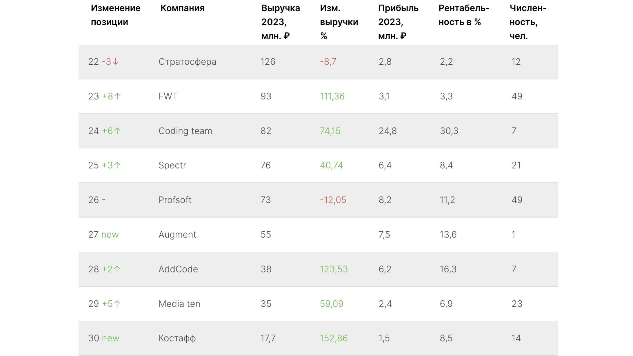 Мы выделили 30 аутстаффинговых компаний из 150. Теперь давайте рассмотрим их подробнее, начиная с компаний, занявших места с 30-го по 22-е.