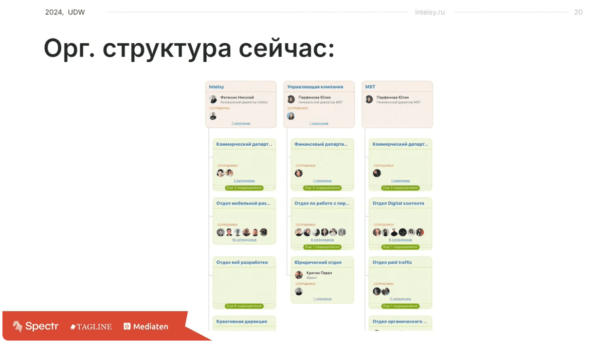 Организационная структура нашей компании выглядит так: существует управляющая компания, к которой относятся финансы, HR и юридический отдел.