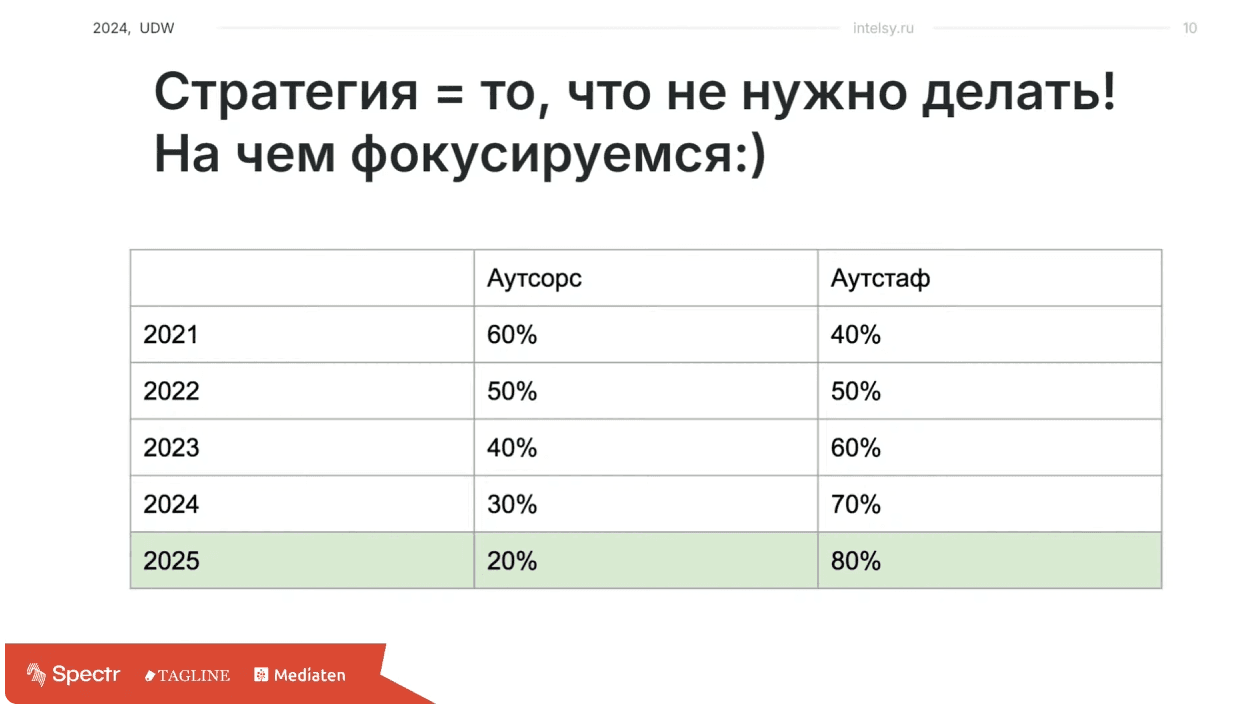 Примером может служить планирование в 2020 году, когда мы ставили целью увеличение доли аутстаффинга с 20% до 80%. К концу 2023 года эта цель была достигнута. Это демонстрирует, как долгосрочное планирование и постановка целей могут привести к успеху. Таким образом, стратегия и фокусировка на ключевых направлениях позволили компании Intelsy успешно развиваться и достигать поставленных целей.