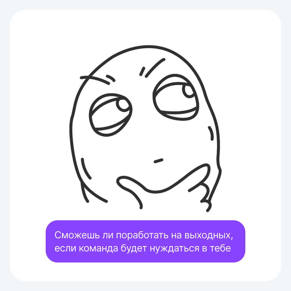 В собеседования включаются абстрактные вопросы: о том, «как вы будете вести себя в конфликтных ситуациях?», «как будете аргументировать свои действия?», «будете ли спорить с коллегами по цеху?», а также «будете ли вы работать в выходные, если потребуется?». Эти темы можно и нужно обсуждать с легкостью, но стоит помнить: каждый ваш ответ может повлечь за собой обязательства, на которые вы сами согласились.