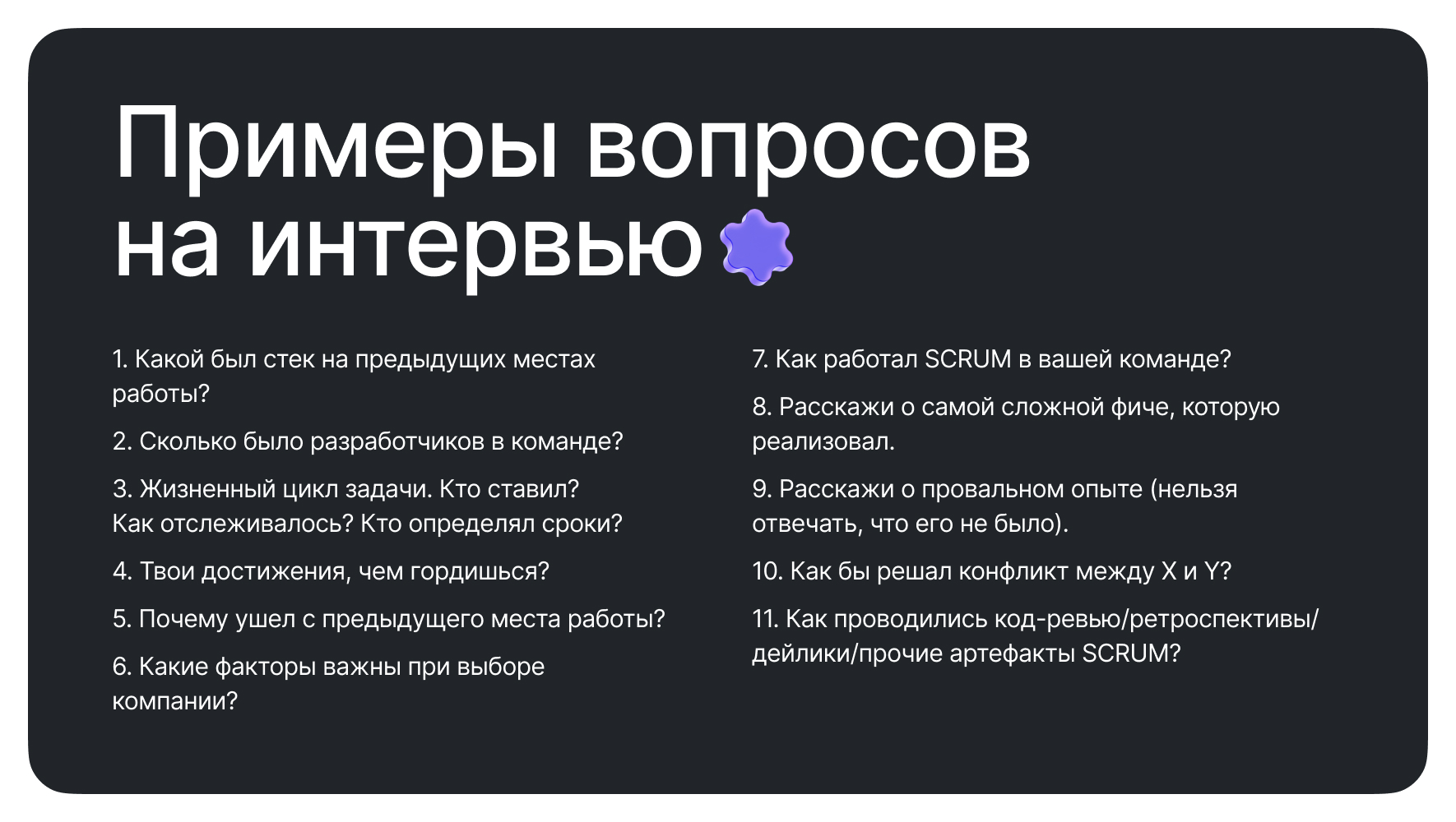 Самые часто задаваемые вопросы легко отыскиваются с помощью соответствующего запроса на всем известном поисковике. Однако, имея собственный опыт подготовки кандидатов к собеседованиям, я хотел бы выделить свой список — наиболее часто встречающихся вопросов. Кандидат должен заранее продумать ответы на типичные вопросы, чтобы суметь дать индивидуальный, персонализированный ответ, ведь каждый интервьюер хочет услышать иные формулировки ответов, чем даёт первая попавшаяся статья в интернете. Выбирать поведенческую роль при ответе стоит вам, так как люди различаются. Перечень вопросов привожу ниже.