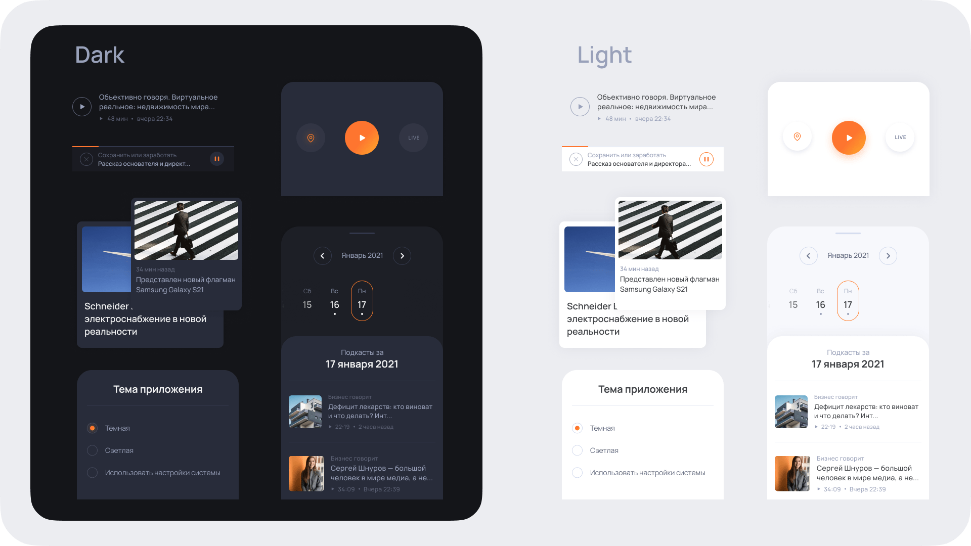 - Разработана и реализована однокнопочная система навигации и управления. В итоге плеер представляет собой одну яркую крупную кнопку в центре экрана и прогресс-бар вокруг нее. Это позволяет запускать и останавливать эфир с любого положения руки, держащей смартфон.