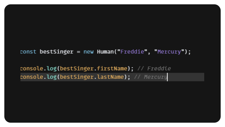 Мы можем заметить что класс Human имеет только два свойства, и в constructor мы присваиваем начальные значения для human-instance.