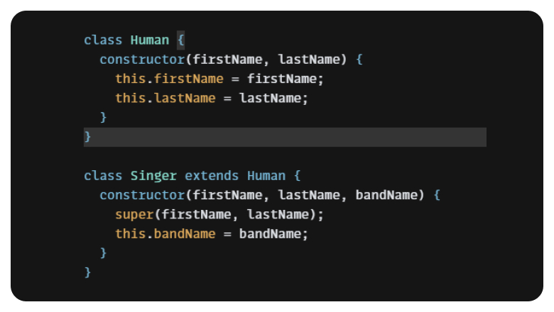 Нам не нужно заново создавать firstName и lastName в Singer, так как это уже было сделано в классе Human. Вы также могли заметить вызов super(firstName, lastName) — это вызов родительского конструктора.