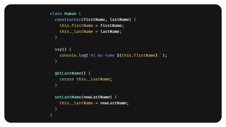 Мы решили, что поле lastName должно быть приватным, поскольку в JS нельзя объявлять приватные поля — существует условность, что перед приватным свойством/методом мы ставим “_”;