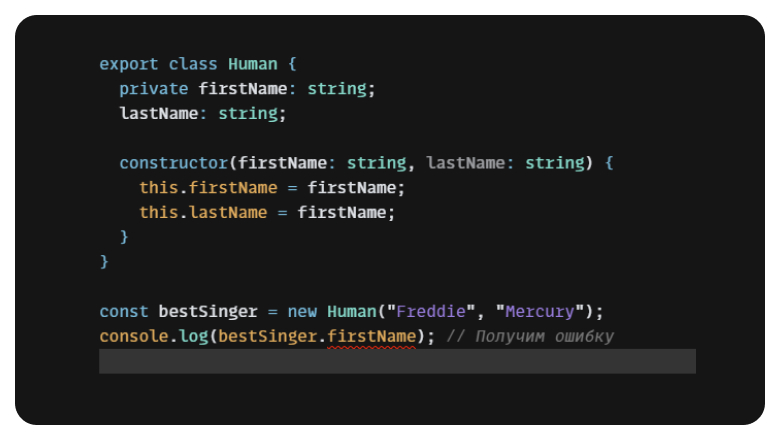 В уже знакомом нам классе Human мы объявили, что поле firstName теперь — приватное поле, и при попытке обратиться к нему извне класса мы получаем ожидаемую ошибку.