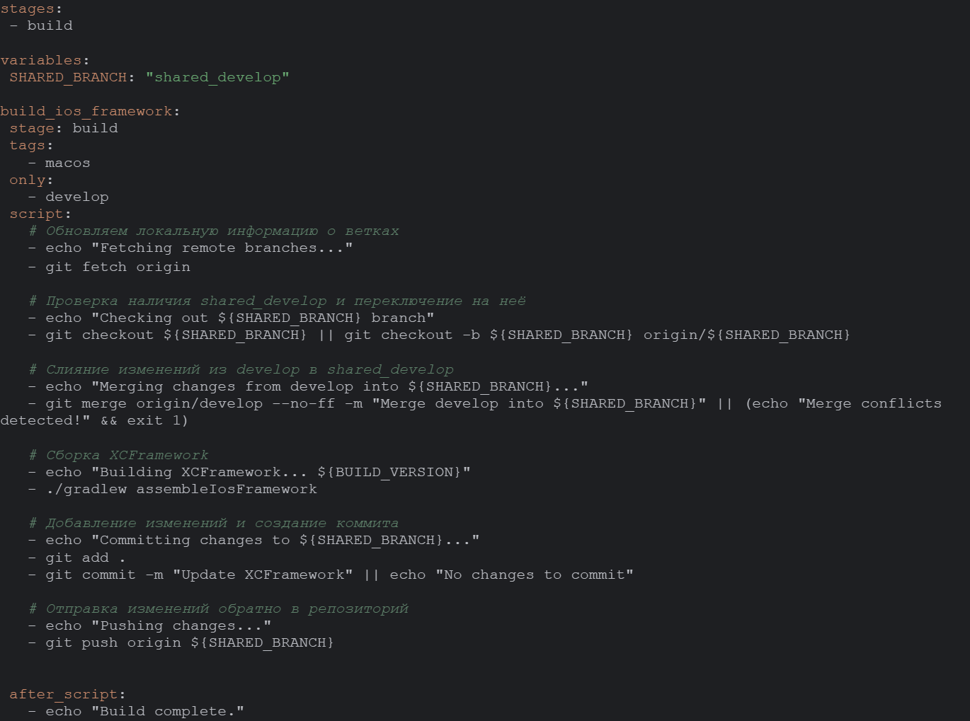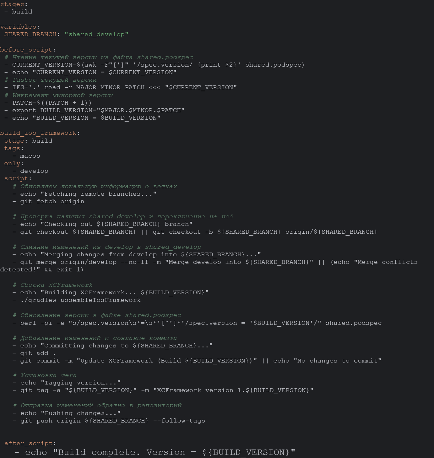 Этот пайплайн запустится на раннере с тэгом macos только после обновления ветки develop. В начале работы скрипта git переключается на ветку, которая будет содержать скомпилированный фреймворк. Затем происходит слияние develop в текущую ветку, чтобы исключить конфликты. Далее происходит сборка фреймворка вызовом gradle таски assembleIosFramework, и фиксирование полученных артефактов в коммите с последующим пушем.