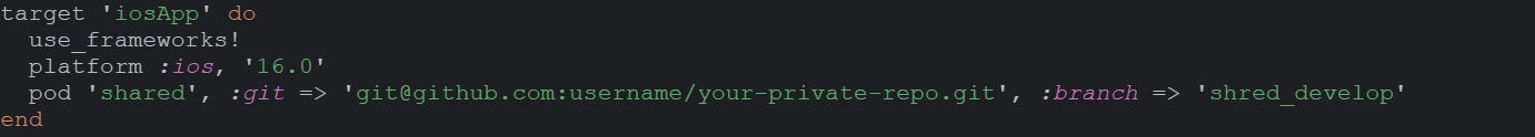 Так как фреймворк располагается только в ветке “shared_develop” в iOS проекте необходимо в Podfile явно указать ветку зависимости через параметр :branch.