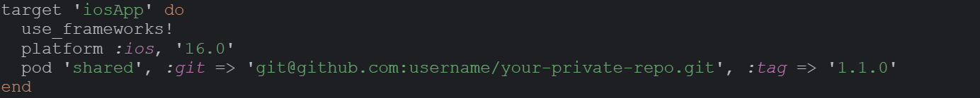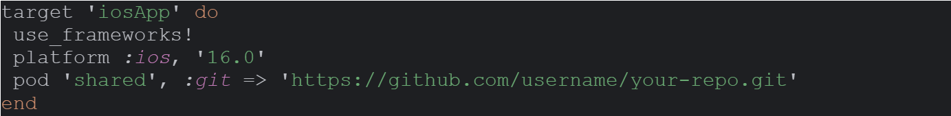 Для подключения общего модуля в iOS проекте добавляем ссылку на репозиторий, используя :git =>””