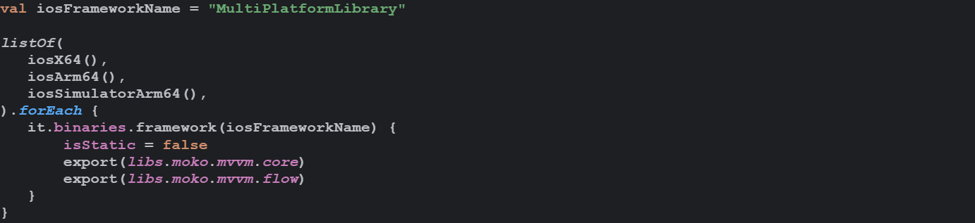 В нашем проекте мы используем библиотеку Moko-MVVM. Для возможности работы с Flow в SwiftUI удобно использовать библиотеку mokoMvvmSwiftUi, подключаемая в iOS проект. Для того, чтобы эта библиотека могла работать название фреймворка должно быть “MultiPlatformLibrary”, а флаг isStatic равен false.