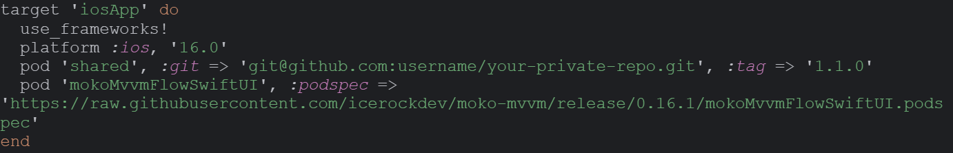 В Podfile дополнительно указываем зависимость mokoMvvmSwiftUi