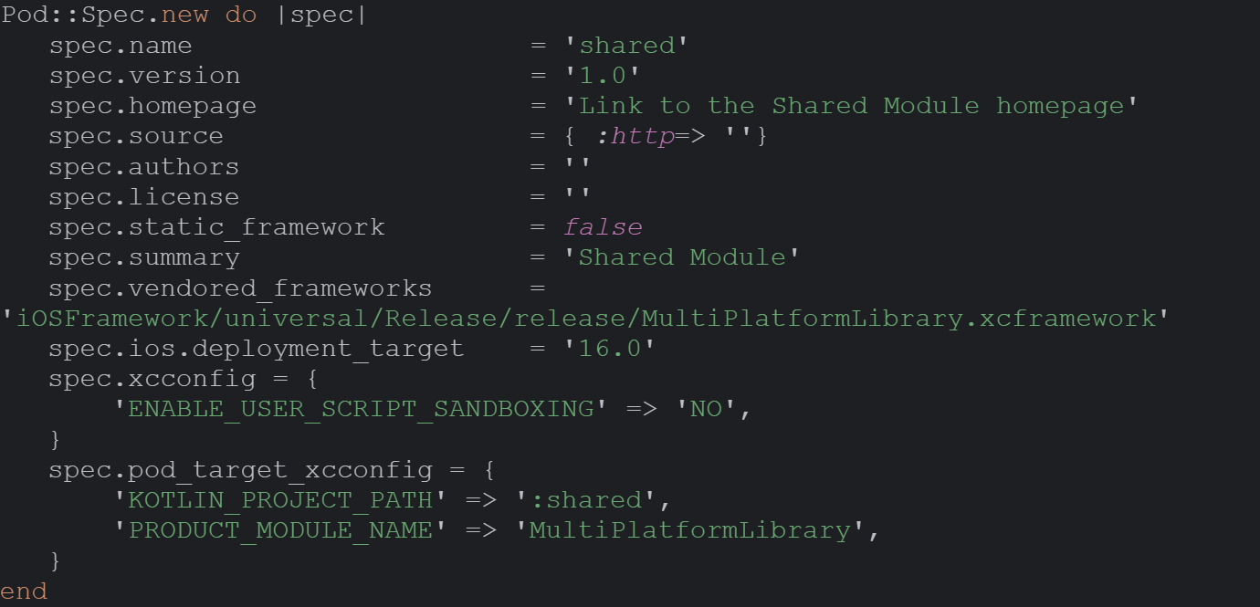 В корне репозитория с sahred модулем создается файл shared.podspec
